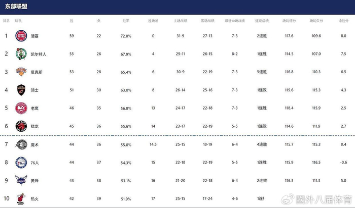 剩下的老鹰、猛龙、魔术、76人,还得为5到8名的位置继续“厮杀”。而附加赛的队伍,像热火、黄蜂,也会是季后赛席位的有力争夺者。想想看,附加赛的胜者,还要去挑战东部第一的活塞,这剧情,可比电视剧还精彩!